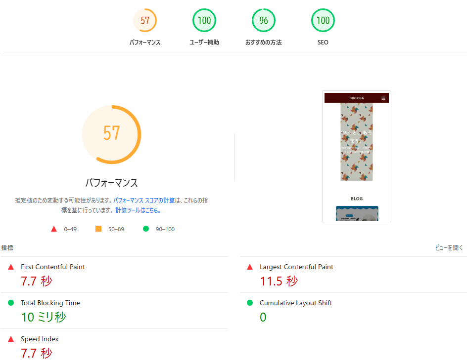 しかし詳細をよく見てみるとLargest Contentful Paintが18.5秒→11.5秒へと7秒の短縮が認められました。そうはいっても高い値であることに変わりはないので、スコアに影響しなかったのでしょうか。