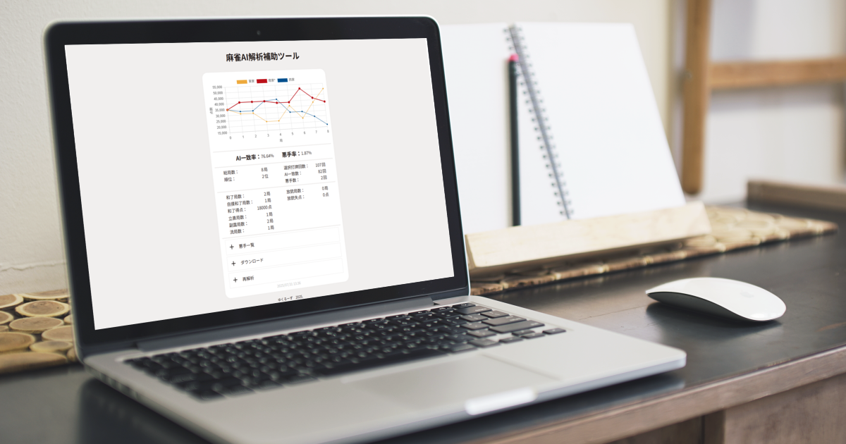 戻る アプリ一覧 麻雀AI解析補助ツール WEBアプリ麻雀AI解析補助ツール 麻雀 条件戦 素点計算ツール WEBアプリ麻雀 条件戦 素点計算ツール 雀魂 段位戦 昇段条件計算ツール WEBアプリ雀魂 段位戦 昇段条件計算ツール Mortal牌譜検討 悪手計算ツール WEBアプリMortal牌譜検討 悪手計算ツール
